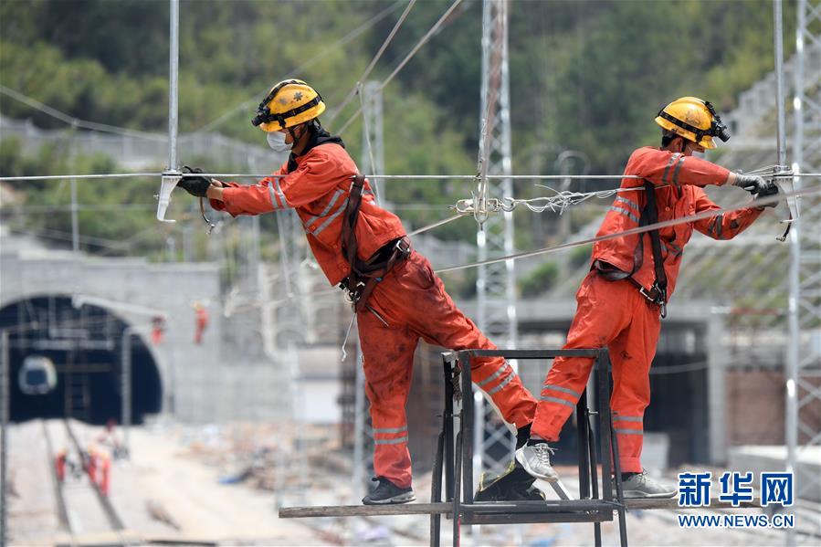 4月25日,在福建省寧德市屏南車站,施工人員開展接觸網(wǎng)調(diào)整作業(yè)。中鐵電氣化局集團(tuán)上海公司推動(dòng)衢寧鐵路福建段通信工程、信號(hào)工程、電力工程、電氣化工程各環(huán)節(jié)協(xié)同復(fù)工復(fù)產(chǎn),目前來(lái)自河北、河南、四川等國(guó)內(nèi)10個(gè)省的900多名員工返崗就業(yè)。衢寧鐵路北起浙江省衢州市,南至福建省寧德市,全長(zhǎng)379.2公里。新華社記者彭張青攝