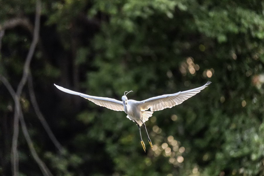 4月15日,攝于南山區(qū)華僑城天鵝堡附近。這是深圳拍鷺鳥的其中一個好去處。白鷺飛行時頭往回縮至肩背處,頸向下曲成袋狀,兩腳向后伸直,遠遠突出于尾后,兩翅緩慢地鼓動飛翔。徐捷攝