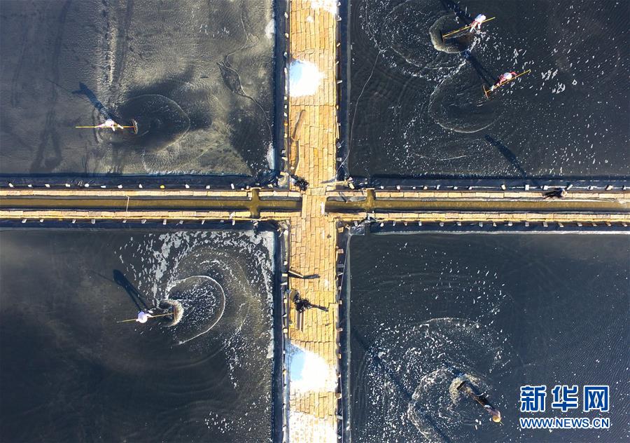 4月27日,莆田鹽場的工人在曬鹽池里忙碌(無人機(jī)照片)。莆田鹽場位于福建省莆田市秀嶼區(qū)東嶠鎮(zhèn),辛勤勞作的鹽工、縱橫交錯的曬鹽池,共同構(gòu)成如畫的風(fēng)景。新華社記者魏培全攝