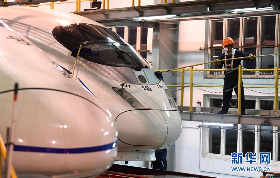 4月29日夜,工作人員在合肥南動車運用所內(nèi)對動車組進行清潔。每當夜深人靜的時候,合肥南動車運用所卻燈火通明,“動車安全守護者”們堅守崗位,對動車組進行全面細致檢修。新華社記者 劉軍喜 攝