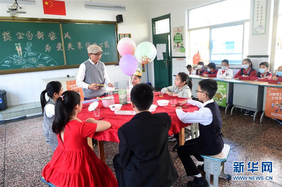4月30日,諸暨市暨陽小學(xué)五年級(jí)4班學(xué)生在表演家庭用餐時(shí)使用公筷公勺的情景劇。當(dāng)日,浙江省諸暨市暨陽小學(xué)五年級(jí)4班開展“公筷公勺新家風(fēng)”主題班會(huì)活動(dòng),通過海報(bào)設(shè)計(jì)、情景劇表演等強(qiáng)化孩子們使用公筷公勺的意識(shí),倡導(dǎo)文明用餐。新華社記者 韓傳號(hào) 攝