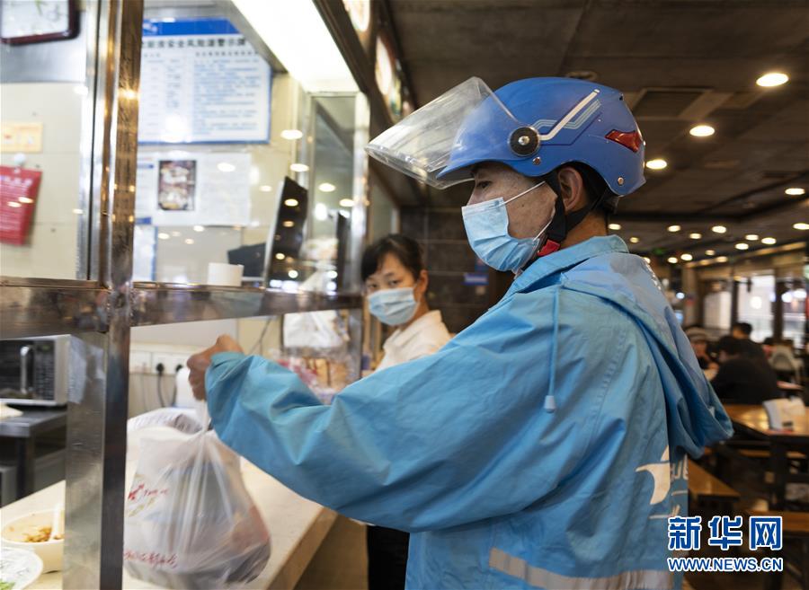 4月22日,在四川省成都市的一家餐廳,邱有哈子在取餐。 新華社記者 李夢(mèng)馨 攝