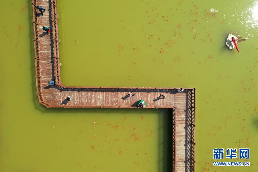 5月1日,游客在河南省鶴壁市淇濱區(qū)鉅橋鎮(zhèn)崗坡村棧橋上游玩(無人機照片)。河南省鶴壁市淇濱區(qū)鉅橋鎮(zhèn)崗坡村是一座有著千年歷史的古村落。近年來,淇濱區(qū)深入踐行鄉(xiāng)村振興戰(zhàn)略,打造以崗坡村為中心的龍崗鄉(xiāng)村振興示范帶,采取“村集體土地入股、資金入股、年底分紅”的運作模式,實現(xiàn)了“資源變資產(chǎn)、資金變股金、村民變股民”的“三變”。農(nóng)戶通過到龍崗鄉(xiāng)村振興示范園打工等方式,實現(xiàn)就近就業(yè),每人每月至少有2500元至3000元的保底工資。  新華社記者馮大鵬攝