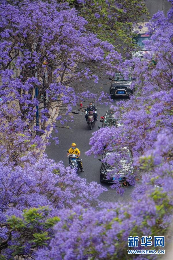 這是5月2日在昆明市桃源街拍攝的藍花楹。近日,云南省昆明市部分街區(qū)的藍花楹競相開放,為春城增添靚麗風景。新華社記者藺以光攝