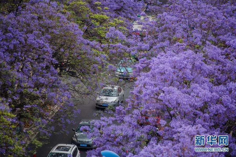 這是5月2日在昆明市教場中路拍攝的藍花楹。近日,云南省昆明市部分街區(qū)的藍花楹競相開放,為春城增添靚麗風(fēng)景。新華社記者胡超攝