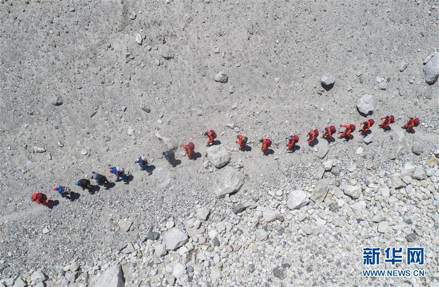 5月6日,登山隊員們向更高海拔進(jìn)發(fā)(無人機(jī)照片)。新華社記者孫非攝