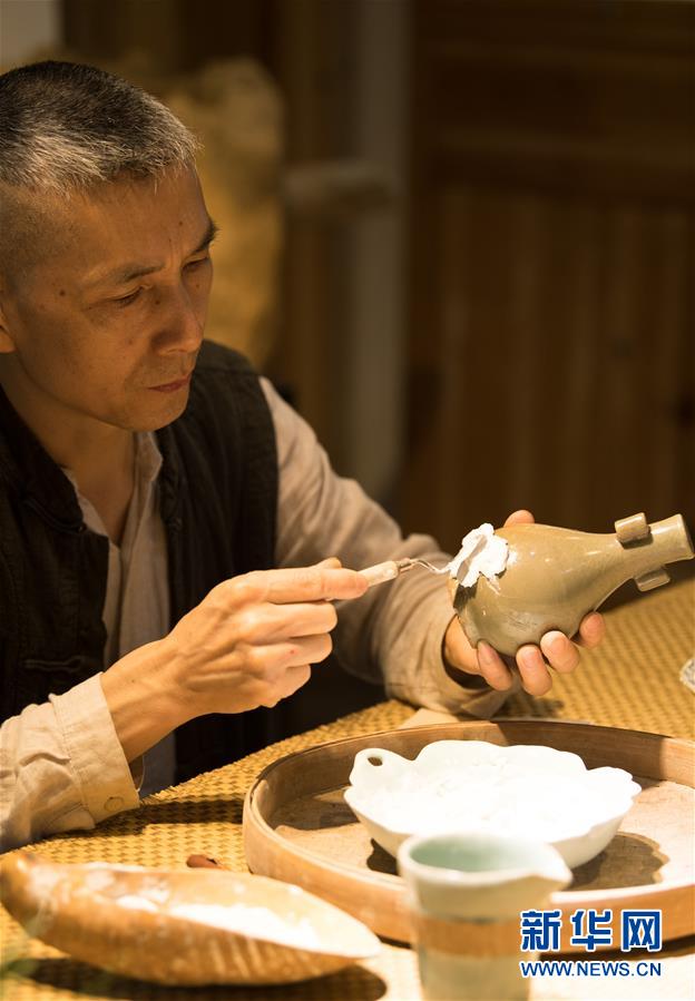 5月8日,項(xiàng)宏金在龍泉青瓷裝飾紋樣研究所修復(fù)古瓷器。1965年出生的項(xiàng)宏金,被浙江龍泉年輕一代瓷人稱為“項(xiàng)哥”,他從20世紀(jì)90年代開(kāi)始收集龍泉青瓷標(biāo)本,研究青瓷紋樣。2014年出版著作《龍泉青瓷裝飾紋樣》,次年開(kāi)設(shè)龍泉青瓷裝飾紋樣研究所,將自己收藏的千余件標(biāo)本跟瓷器愛(ài)好者、創(chuàng)作者免費(fèi)分享。新華社記者翁忻旸攝