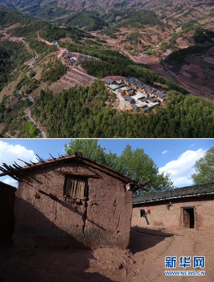 這是一張拼版照片,上圖為:昭覺縣三岔河鄉(xiāng)三河村一個(gè)易地扶貧安置點(diǎn)(2020年4月20日攝,無人機(jī)照片);下圖為:昭覺縣三岔河鄉(xiāng)三河村村民原來居住的土坯房(2020年4月20日攝)。新華社記者江宏景攝