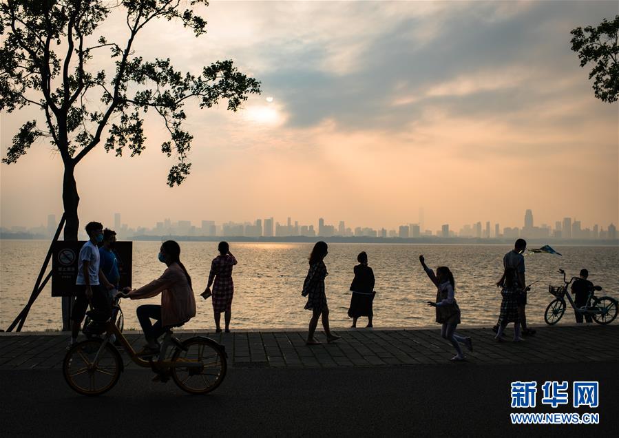 人們?cè)谖錆h東湖綠道游玩(5月5日攝)。 新華社記者 肖藝九 攝
