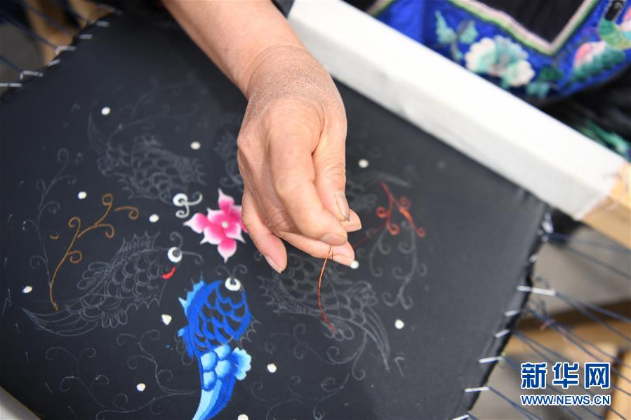 吳美金在十八洞村苗繡特產(chǎn)農(nóng)民專業(yè)合作社繡苗繡(4月24日攝)。1967年出生的吳美金,1992年嫁入飛蟲村(現(xiàn)十八洞村飛蟲寨)時,只有爛泥路的飛蟲村不僅田土少,掙錢活路也少,生活十分困難。2014年,吳美金加入了十八洞村苗繡特產(chǎn)農(nóng)民專業(yè)合作社,從小就會的苗繡傳統(tǒng)手藝如今成了家庭增收的法寶,不僅在家門口就把錢掙了,同時還能照顧年幼的孫子孫女?!艾F(xiàn)在的日子,比年輕的時候好多了?!眳敲澜鹫f。新華社記者薛宇舸攝