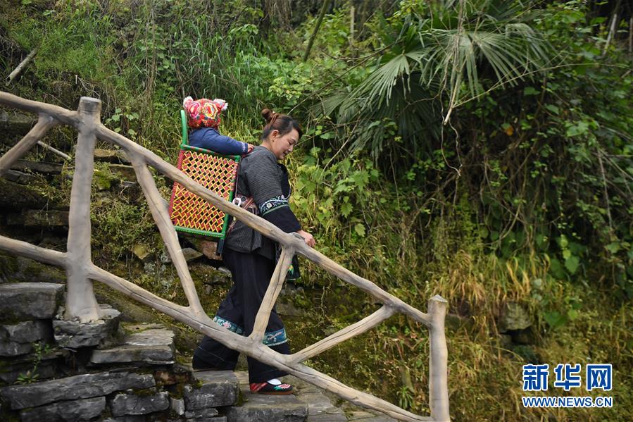 吳美金背著孫子走在十八洞村中,準(zhǔn)備前往村里的苗繡合作社(4月24日攝)。1967年出生的吳美金,1992年嫁入飛蟲村(現(xiàn)十八洞村飛蟲寨)時,只有爛泥路的飛蟲村不僅田土少,掙錢活路也少,生活十分困難。2014年,吳美金加入了十八洞村苗繡特產(chǎn)農(nóng)民專業(yè)合作社,從小就會的苗繡傳統(tǒng)手藝如今成了家庭增收的法寶,不僅在家門口就把錢掙了,同時還能照顧年幼的孫子孫女?!艾F(xiàn)在的日子,比年輕的時候好多了。”吳美金說。新華社記者薛宇舸攝