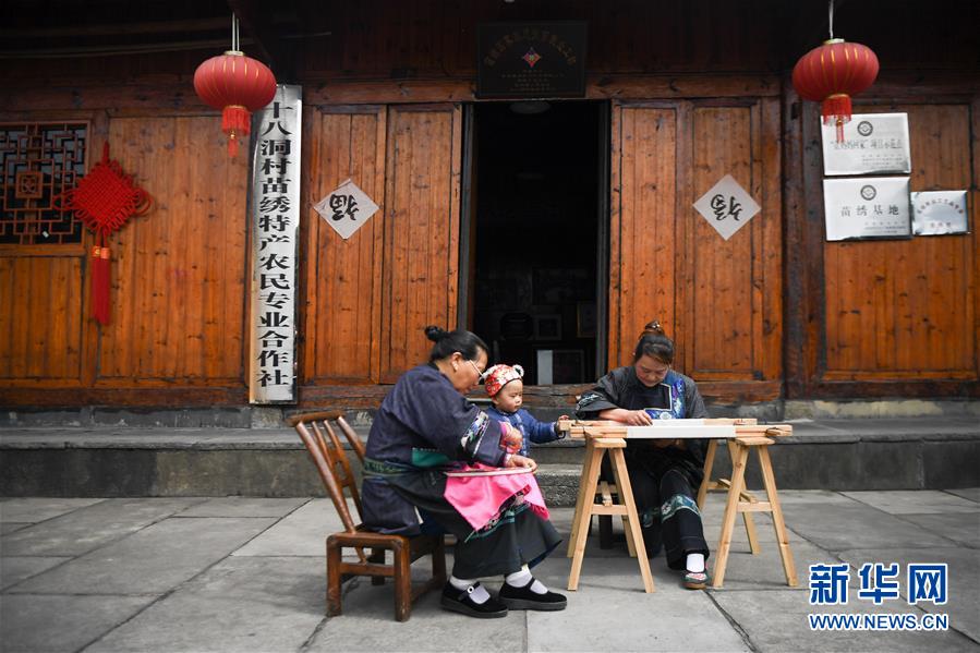 吳美金(右)在十八洞村苗繡特產(chǎn)農(nóng)民專業(yè)合作社繡苗繡(4月24日攝)。1967年出生的吳美金,1992年嫁入飛蟲村(現(xiàn)十八洞村飛蟲寨)時,只有爛泥路的飛蟲村不僅田土少,掙錢活路也少,生活十分困難。2014年,吳美金加入了十八洞村苗繡特產(chǎn)農(nóng)民專業(yè)合作社,從小就會的苗繡傳統(tǒng)手藝如今成了家庭增收的法寶,不僅在家門口就把錢掙了,同時還能照顧年幼的孫子孫女?!艾F(xiàn)在的日子,比年輕的時候好多了。”吳美金說。新華社記者薛宇舸攝