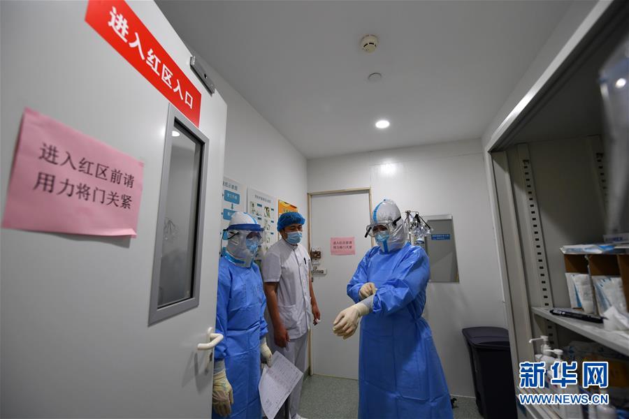 5月11日,在空港醫(yī)院隔離病房,穿戴好防護(hù)服的醫(yī)護(hù)人員準(zhǔn)備進(jìn)入“紅區(qū)”。