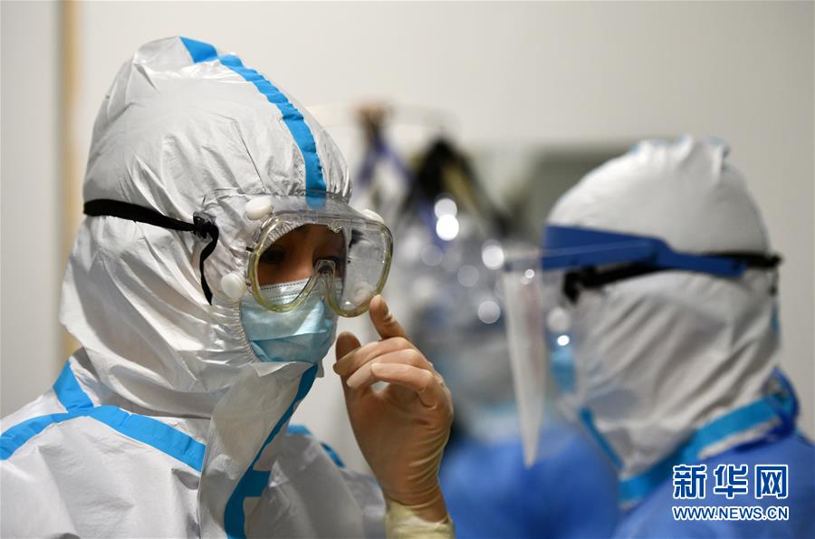 5月11日,在空港醫(yī)院隔離病房,穿戴好防護服的醫(yī)護人員準備進入“紅區(qū)”。