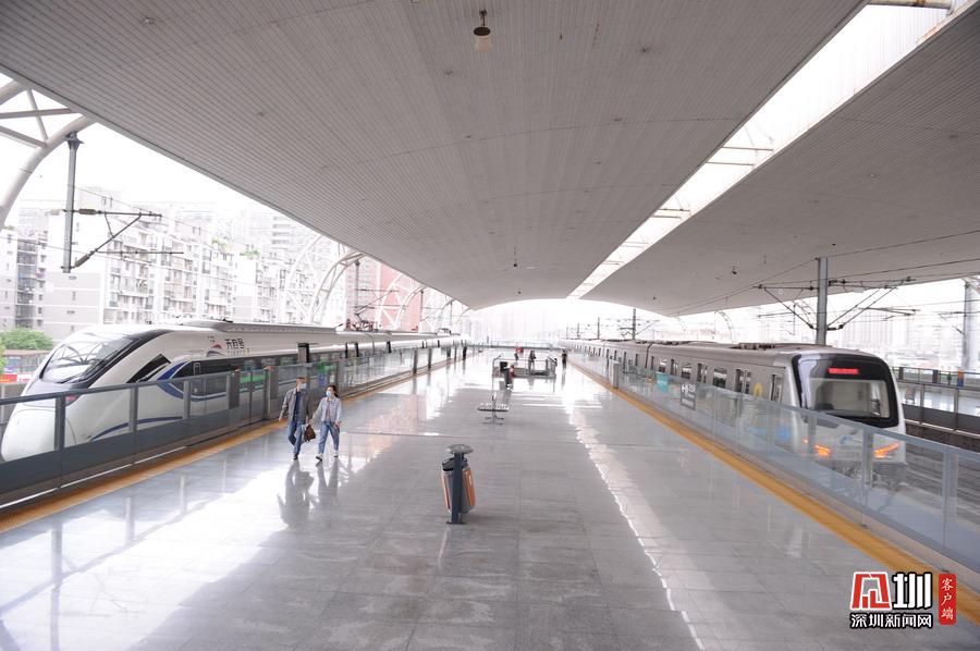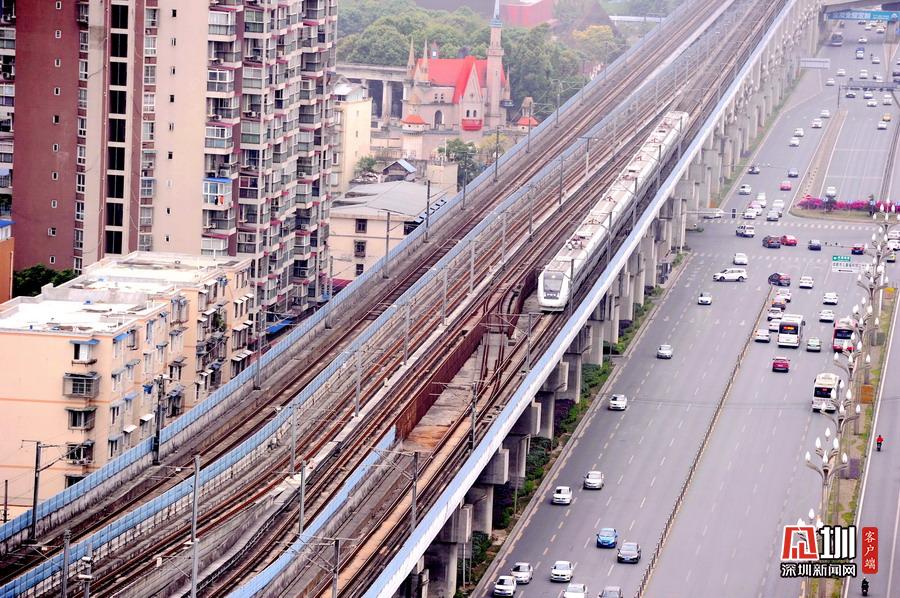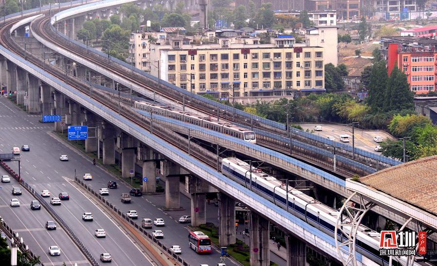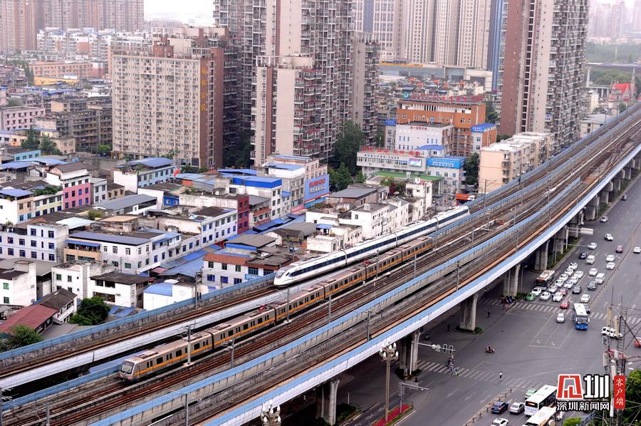 2020年5月11日,四川省成都市,犀浦站是全國首個鐵路與地鐵換乘車站。圖為動車、地鐵同時運行在線路上。