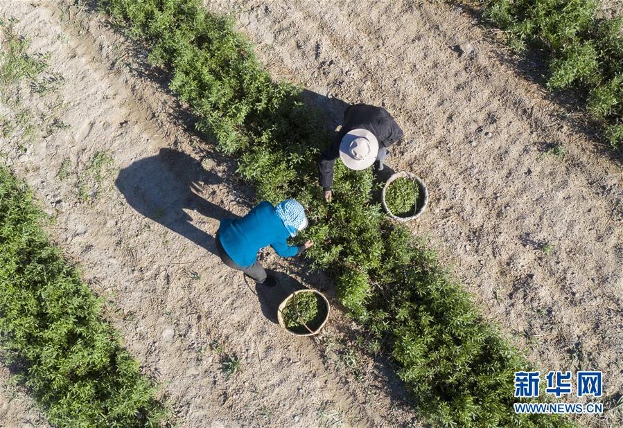 5月11日,采茶工在寧夏百瑞源賀蘭山基地采摘枸杞芽茶(無人機照片)。當日,寧夏百瑞源賀蘭山基地枸杞芽茶全面進入采摘季。據了解,該基地茶園面積300余畝,助力附近200多名農民就業(yè)增收。新華社記者楊植森攝