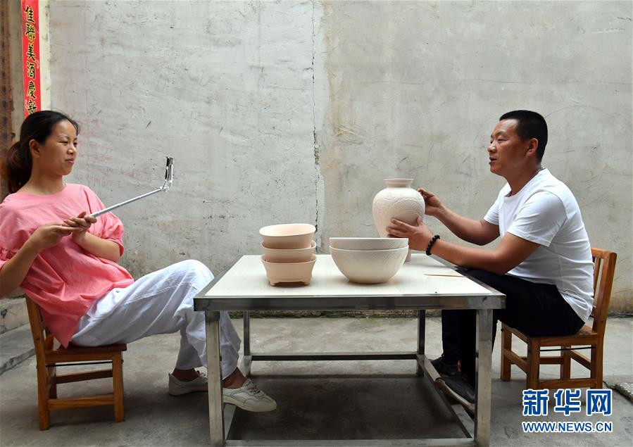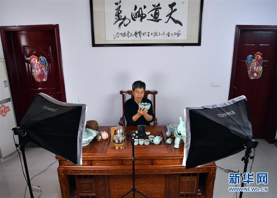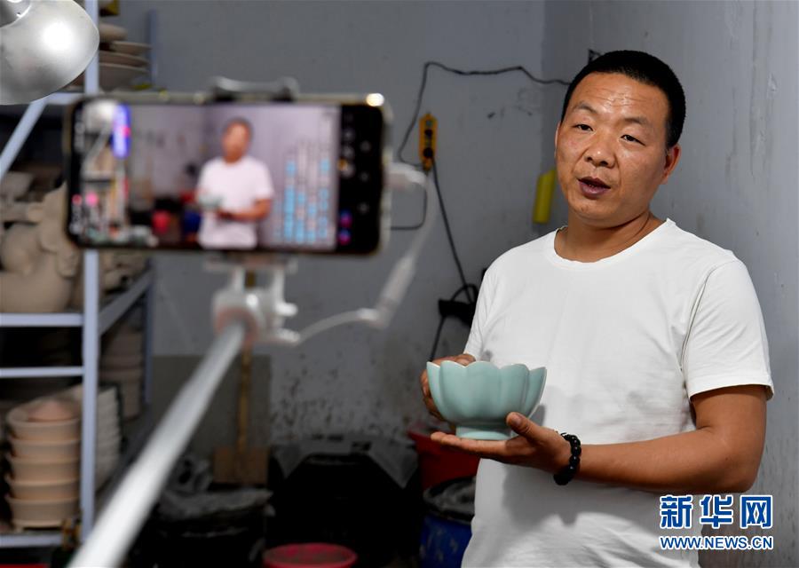 5月13日,寶豐縣大營鎮(zhèn)的汝瓷藝人王國奇在拍攝汝瓷產(chǎn)品短視頻。新華社記者李嘉南攝