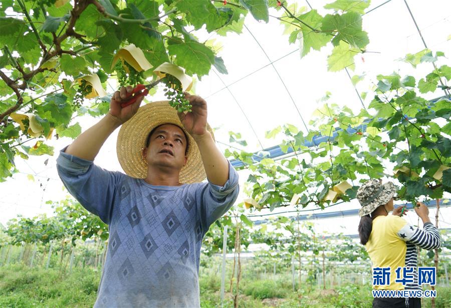 5月13日,在福建省建甌市小橋鎮(zhèn)陽(yáng)澤村誠(chéng)源果蔬專業(yè)合作社,村民在修剪葡萄枝葉。誠(chéng)源果蔬專業(yè)合作社有葡萄園100多畝,產(chǎn)品供應(yīng)北京上海市場(chǎng),村民可以在葡萄園內(nèi)從事季節(jié)性工作。新華社記者賀燦鈴攝