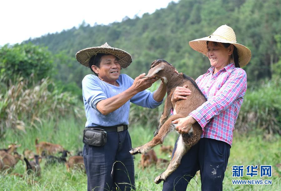 5月13日,在福建省建甌市小橋鎮(zhèn)陽(yáng)澤村,村民呂元鑫(左)和妻子抱起一只小羊。62歲的呂元鑫曾因病返貧,2016年后通過扶貧貸款從事山羊養(yǎng)殖,現(xiàn)已還清貸款,每年養(yǎng)殖收入兩三萬元。新華社記者林善傳攝