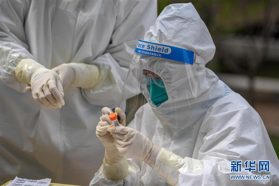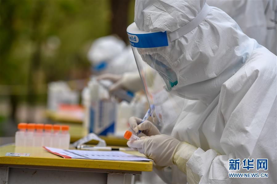 5月15日,在舒蘭市建馨園小區(qū),工作人員進行采樣準備工作。當日,從吉林市7家市直醫(yī)院抽調的300名護士經培訓后,全部投入到舒蘭市(隸屬于吉林市)核酸采樣工作中。為提供追溯傳染源所必需的核酸檢測相關數據,舒蘭市根據確診病例的活動軌跡,將流調和核酸檢測范圍擴大至本地確診病例和無癥狀感染者的次密接人員及一般接觸者。新華社記者張楠攝