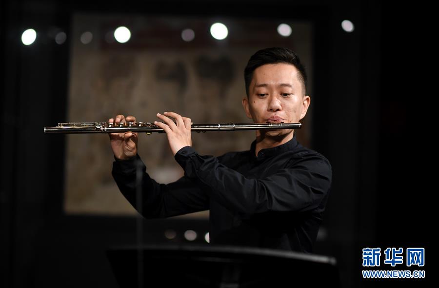 在陜西歷史博物館唐代壁畫珍品館,西安交響樂團長笛首席孫丁為“云上國寶”音樂會彩排(5月14日攝)。為迎接國際博物館日,5月14日,西安交響樂團走進陜西歷史博物館唐代壁畫珍品館,為5月18日的“云上國寶”音樂會彩排。觀眾將通過網(wǎng)絡(luò)直播,在聆聽天籟的同時欣賞國之瑰寶,感受藝術(shù)與美的和諧共鳴。新華社記者李一博攝