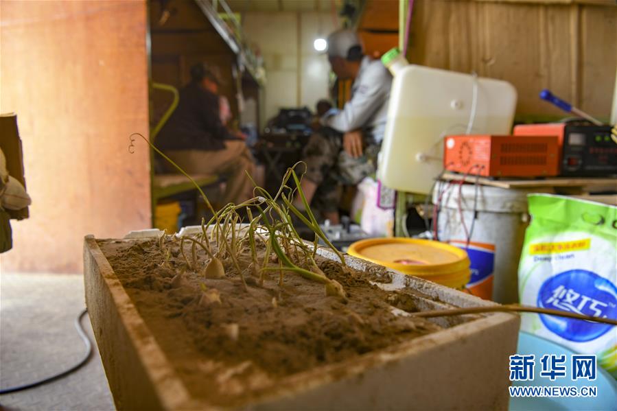 工人在營房內(nèi)休息聊天,房內(nèi)一角擺放著他們種植的小蒜苗(5月16日攝)。他們說,種蒜苗就是為了看看綠色植物。新華社記者胡虎虎攝