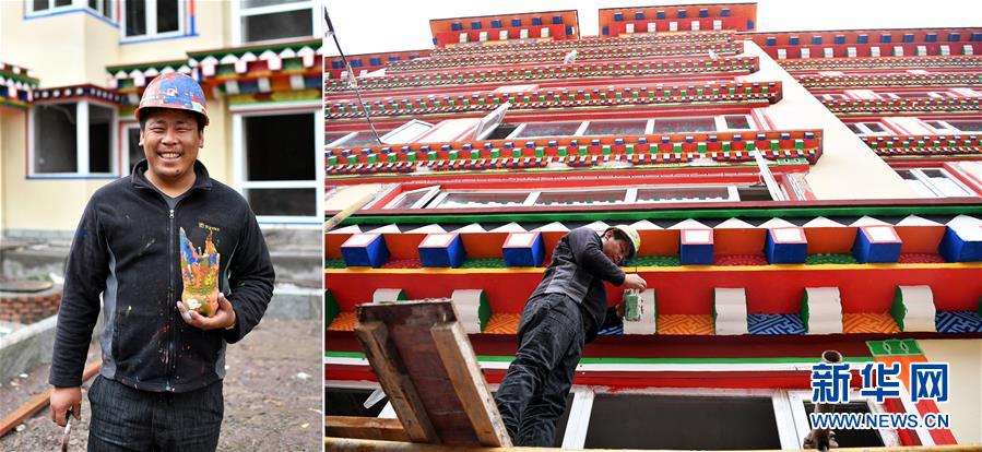 拼版照片:左圖為西藏昌都市卡若區(qū)卡若鎮(zhèn)卡若村村民洛松郎直;右圖為洛松郎直在昌都市一處建筑工地進(jìn)行外墻彩繪作業(yè)。洛松郎直從小就喜歡畫畫,由于家境貧寒,初中畢業(yè)后,他回到家里干農(nóng)活、放牧,挑起家庭重?fù)?dān),但一直沒有放棄畫畫的夢想。后來,洛松郎直前往卡若區(qū)拉多鄉(xiāng)學(xué)習(xí)唐卡繪畫,技藝得到很大提高。2017年,洛松郎直為卡若區(qū)一個周轉(zhuǎn)房建設(shè)項目繪制墻體彩繪。2018年,在村里的支持下,洛松郎直創(chuàng)辦了公司,承攬更多的藏式墻體彩繪工程(4月30日攝)。新華社記者詹彥攝