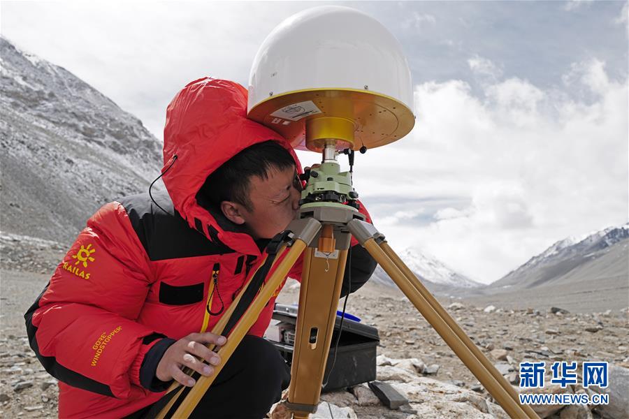 國測一大隊隊員在珠峰大本營附近測試設(shè)備(5月17日攝)。新華社記者普布扎西攝