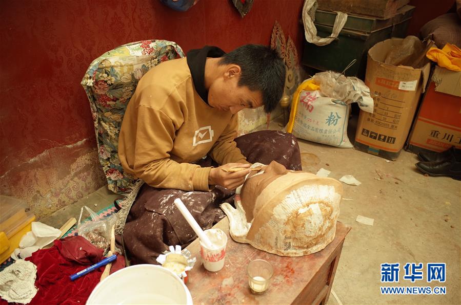 在西藏拉薩市達(dá)孜區(qū),西洛的學(xué)徒旦增扎西在給面具塑形(5月15日攝)。新華社記者格桑邊覺攝