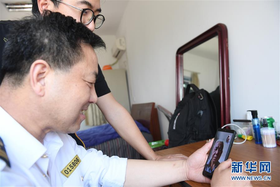 5月20日,在寧波七里嶼,前來運(yùn)送物資的葉家第四代燈塔工葉靜虎(前)和兒子葉超群在宿舍內(nèi)跟第三代燈塔工葉中央視頻通話。葉超群自2013年起在七里嶼燈塔工作,葉靜虎從燈塔工崗位上退下來后,目前在寧波航標(biāo)處后勤事務(wù)中心工作。新華社記者翁忻旸攝