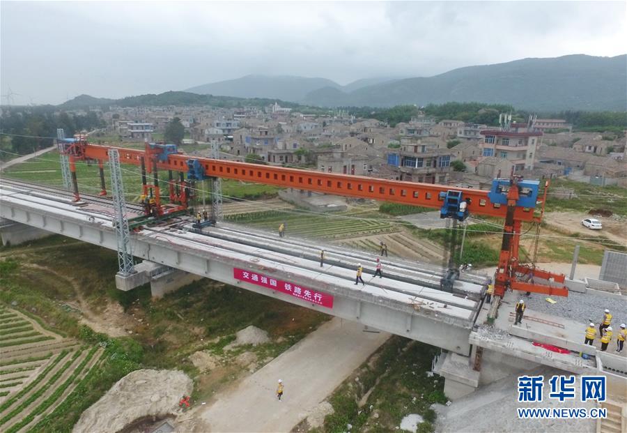 5月20日,福平鐵路洋中特大橋最后一片T型梁成功架設(shè)(無(wú)人機(jī)照片)。新華社記者林善傳攝