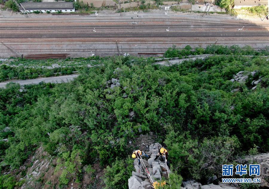 5月21日,捅山工在打安全樁。新華社記者郝源攝