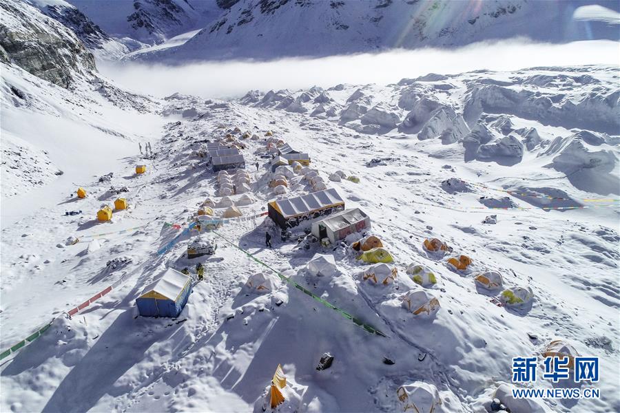 位于珠峰東絨布冰川旁海拔6500米的珠峰前進(jìn)營地(5月22日攝,無人機(jī)照片)。