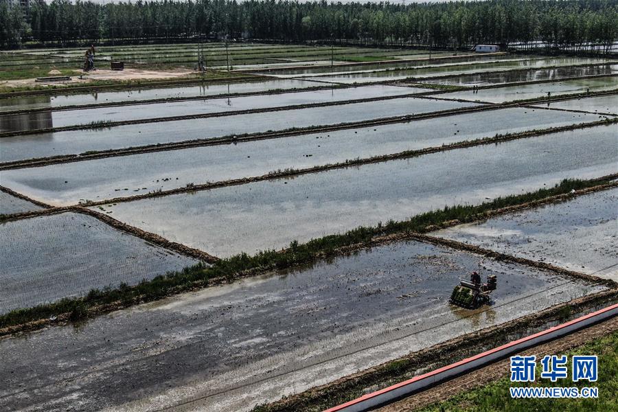 5月24日,盤錦市大洼區(qū)的農(nóng)民在駕駛插秧機(jī)插秧(無人機(jī)照片)。新華社記者潘昱龍攝