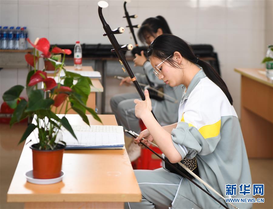 位于湖南省湘西土家族苗族自治州的瀘溪縣第五中學(xué)的學(xué)生在練習(xí)二胡(5月22日攝)。
