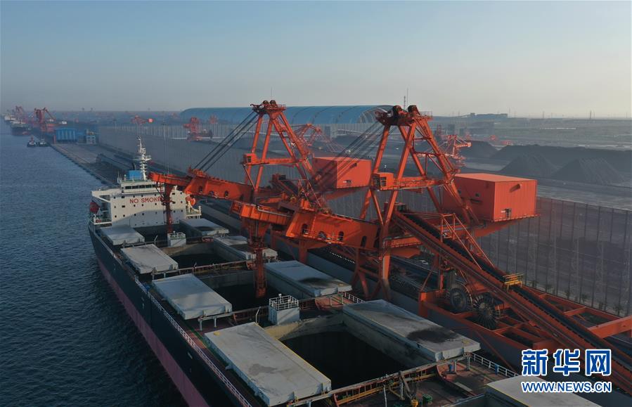 5月22日,一艘輪船靠泊在唐山港曹妃甸港區(qū)煤碼頭三期工程的先期工程泊位裝貨(無人機照片)。新華社記者楊世堯攝