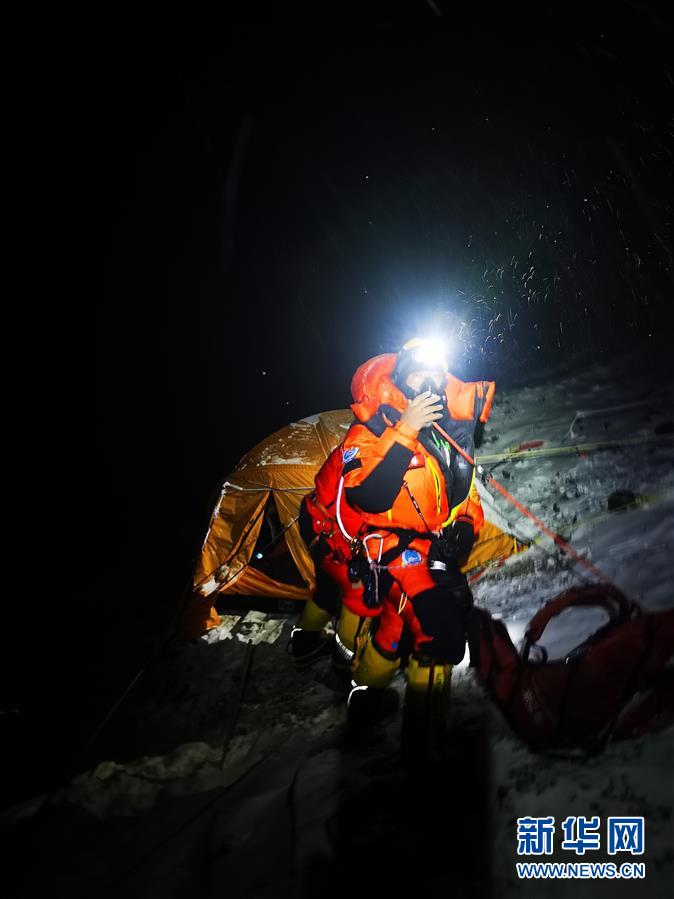 5月27日,在海拔5200米的珠峰大本營(yíng),2020珠峰高程測(cè)量登山隊(duì)總指揮、國(guó)家體育總局登山運(yùn)動(dòng)管理中心副主任王勇峰正在和位于海拔8300米突擊營(yíng)地的測(cè)量登山隊(duì)隊(duì)員通話。新華社記者孫非攝