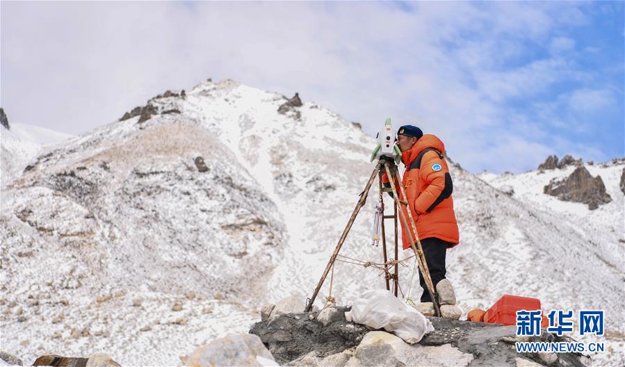 自然資源部第一大地測量隊(duì)隊(duì)員鄭林在使用全站儀對(duì)珠峰峰頂進(jìn)行交會(huì)觀測(5月27日攝)。新華社記者普布扎西攝