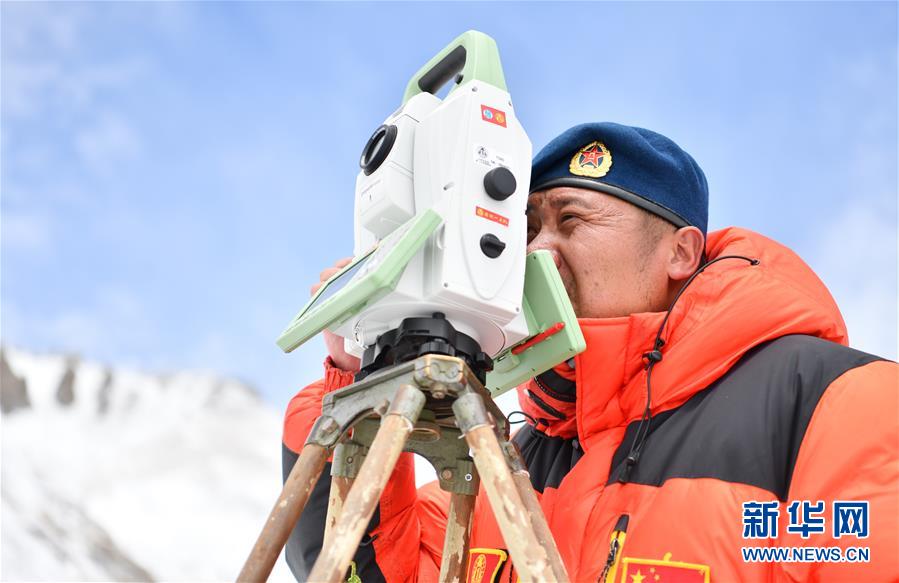 自然資源部第一大地測量隊隊員鄭林在使用全站儀對珠峰峰頂進行交會觀測(5月27日攝)。新華社記者晉美多吉攝