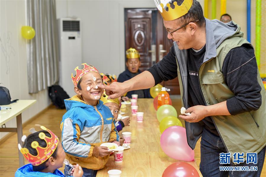 5月27日,玉麥鄉(xiāng)小學(xué)的孩子們一起唱生日歌。新華社記者王炳坤攝