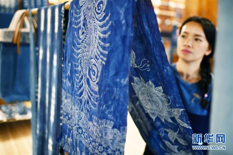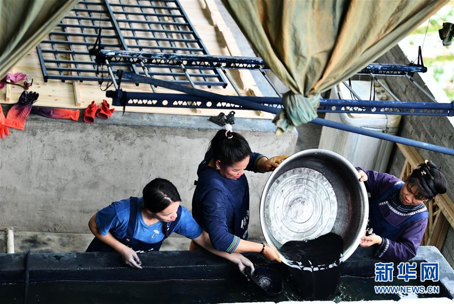 2018年,楊成蘭在村里成立傳統(tǒng)織染合作社,吸引村里及周邊村寨貧困戶入股,帶動當?shù)刎毨艉痛迕窦尤牒献魃纾瑥氖驴棽?、染布、藍靛種植等產業(yè),在傳承民族傳統(tǒng)手工技藝的同時,幫助村民脫貧增收。新華社記者楊文斌攝