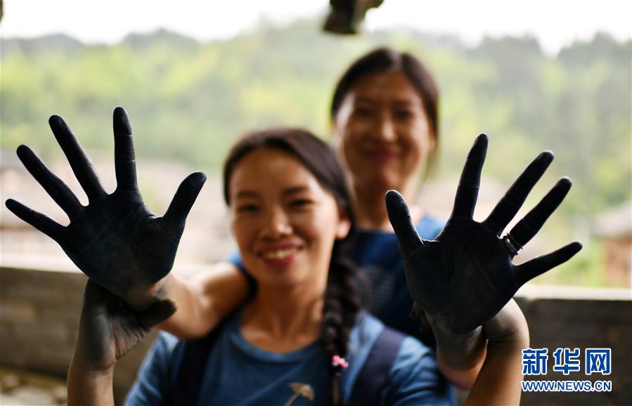 楊成蘭(前)與一名學徒在展示被植物染料染黑的雙手(5月28日攝)。