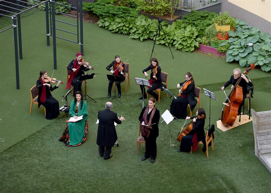 5月30日,在奧地利維也納“時(shí)代精神”酒店的庭院內(nèi),歌劇樂團(tuán)為觀眾演出。當(dāng)日,奧地利首都維也納的一家名為“時(shí)代精神”的酒店為迎接“解封”后恢復(fù)營業(yè),在其庭院內(nèi)舉辦“窗口音樂會(huì)”。按照奧政府此前公布的“解封”時(shí)間表,從29日起,賓館酒店以及健身房、游泳池和游樂場(chǎng)等休閑娛樂場(chǎng)所有條件恢復(fù)運(yùn)營。新華社記者郭晨攝