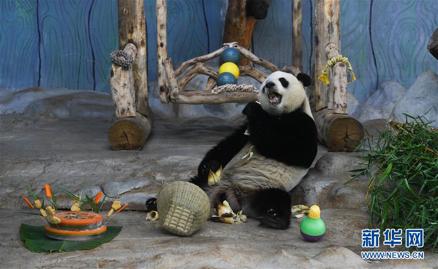 6月1日,大熊貓“貢貢”在進食。新華社記者楊冠宇攝