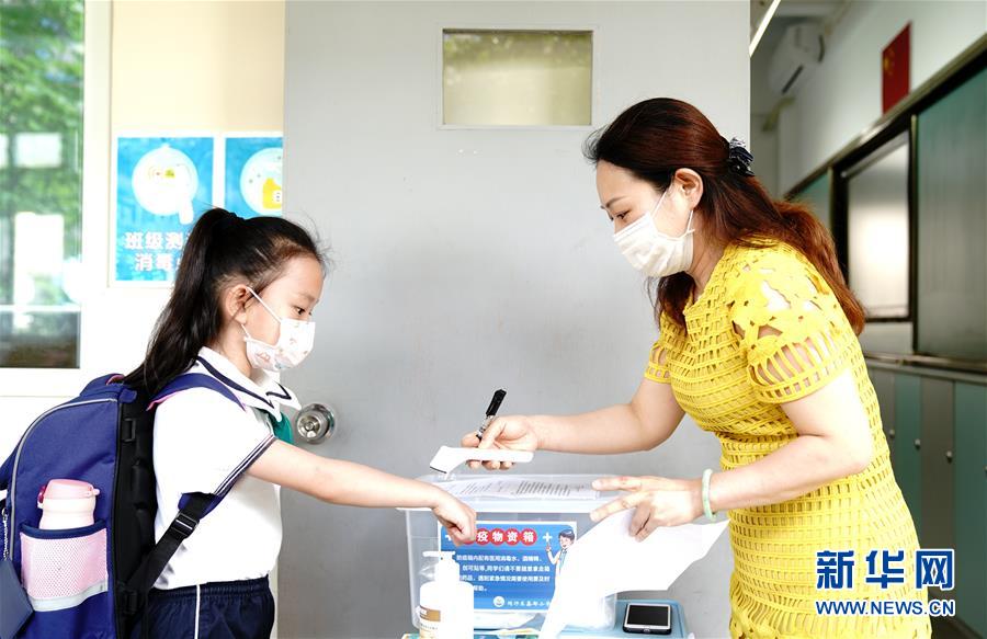 6月2日,上海閔行區(qū)鑫都小學(xué),老師為一名一年級(jí)小學(xué)生量體溫。當(dāng)日,上海小學(xué)一、二、三年級(jí)學(xué)生返校開學(xué)。新華社記者張建松攝。