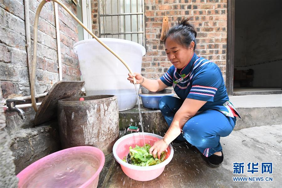在廣西環(huán)江毛南族自治縣下南鄉(xiāng)下南社區(qū)松朗屯,覃鳳增在用自來(lái)水洗菜(5月22日攝)。新華社記者陸波岸攝。