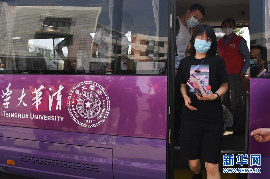6月6日,在清華大學,返校學生走下清華大學接站專車。