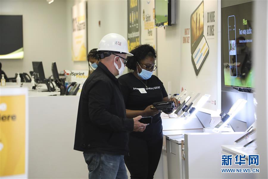 6月8日,店員(右)在美國紐約一家電信運營商營業(yè)廳內(nèi)為顧客服務(wù)。在因新冠疫情進(jìn)入“居家令”近三個月之后,美國紐約市于當(dāng)?shù)貢r間8日開始“解封”,進(jìn)入經(jīng)濟(jì)重啟的第一階段。新華社記者王迎攝