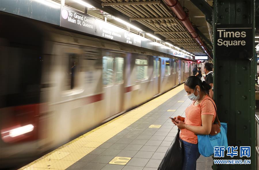 6月8日,佩戴口罩的乘客在美國紐約一地鐵站內(nèi)等車,地面上安置了保持社交距離的標(biāo)記。在因新冠疫情進(jìn)入“居家令”近三個月之后,美國紐約市于當(dāng)?shù)貢r間8日開始“解封”,進(jìn)入經(jīng)濟(jì)重啟的第一階段。新華社記者王迎攝