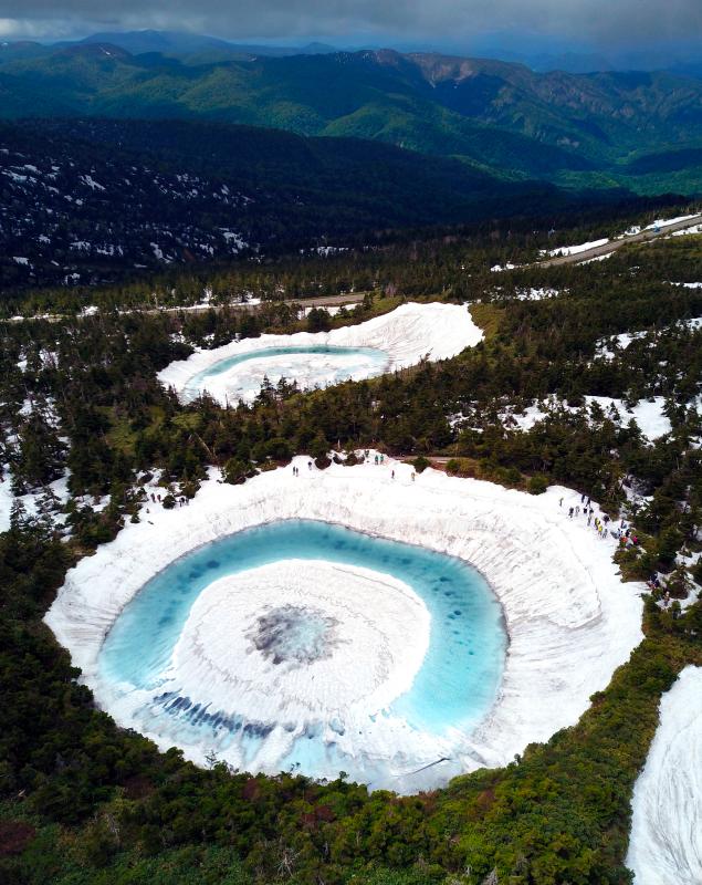 當(dāng)?shù)貢r(shí)間2020年6月8日,日本,在橫跨巖手縣與秋田縣的八幡平山頂附近的“鏡沼”,伴隨著“鏡沼”的積雪從外側(cè)逐漸融化,外圍的碧藍(lán)色湖水與中心部的潔白積雪相映成趣,呈現(xiàn)出獨(dú)特的類(lèi)似“龍眼”的景象。據(jù)悉,八幡平“龍眼”奇景只在每年5月下旬至6月初的雪融期間短暫出現(xiàn)。